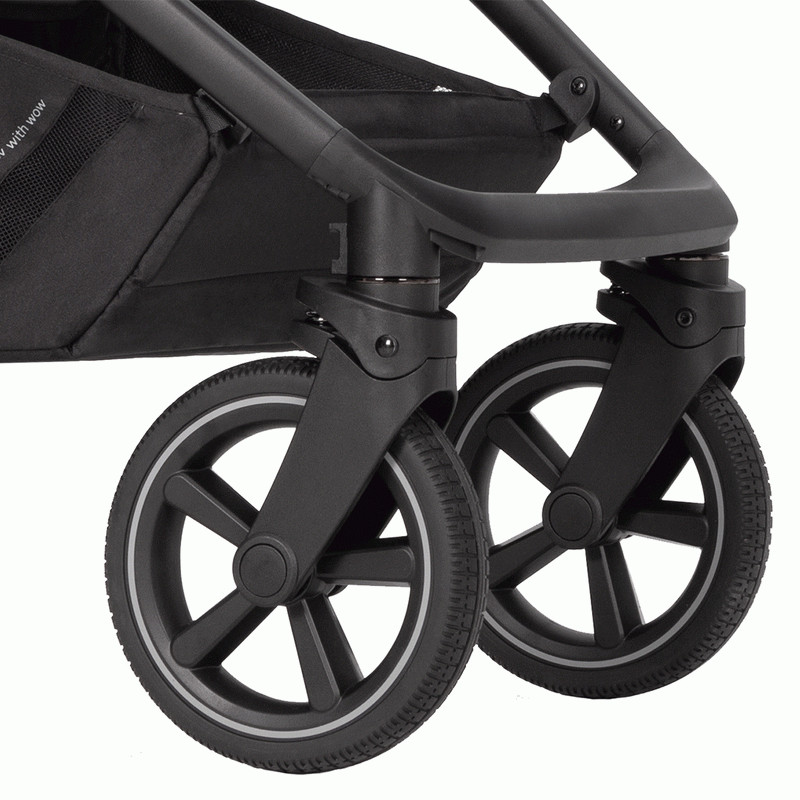 · Колёса большие, из резины, не боятся проколов и перепада температур. Передние манёвренные с фиксацией в положение «прямо», задние большого диаметра для лучшей проходимости.